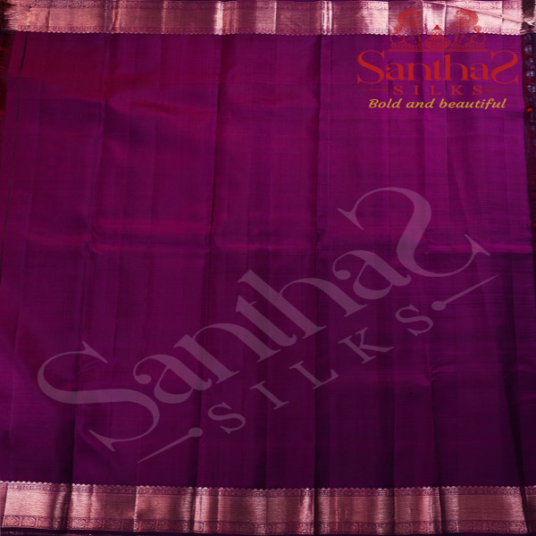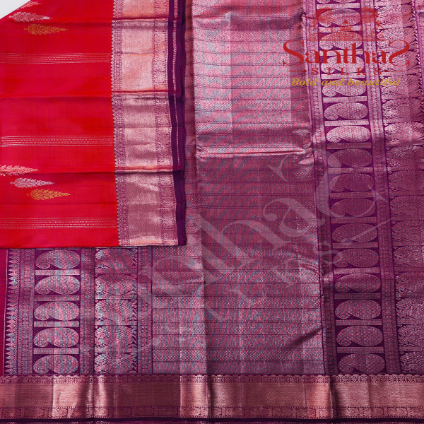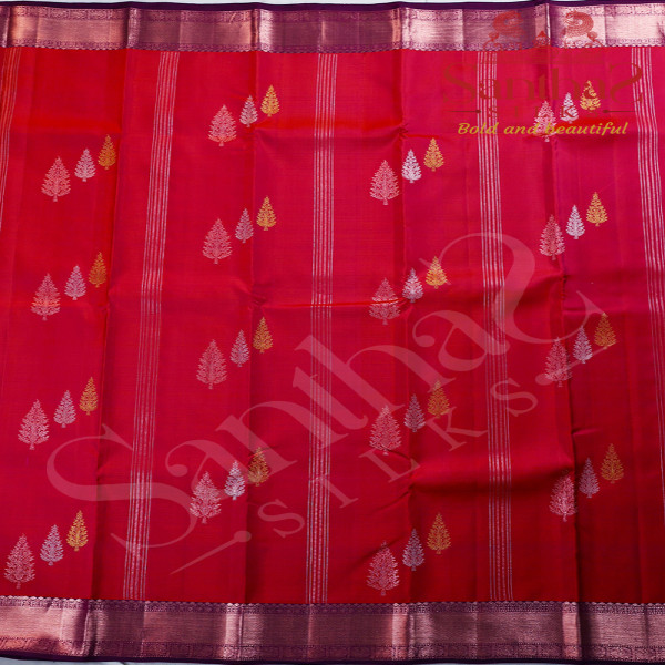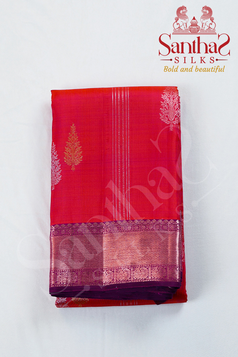 Pinkish Orange Double Shade Pure Silk Saree with Wine Red Border, Gold, Copper, Silver Buttas in it