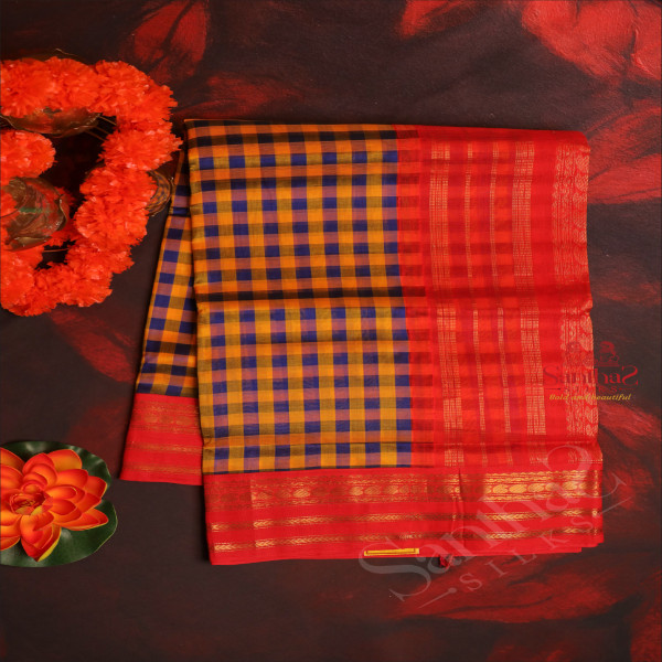 BLUE AND YELLOW COLOUR CHECKED BODY WITH CONTRAST BLOUSE & BORDER