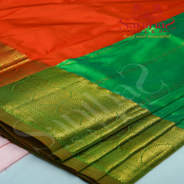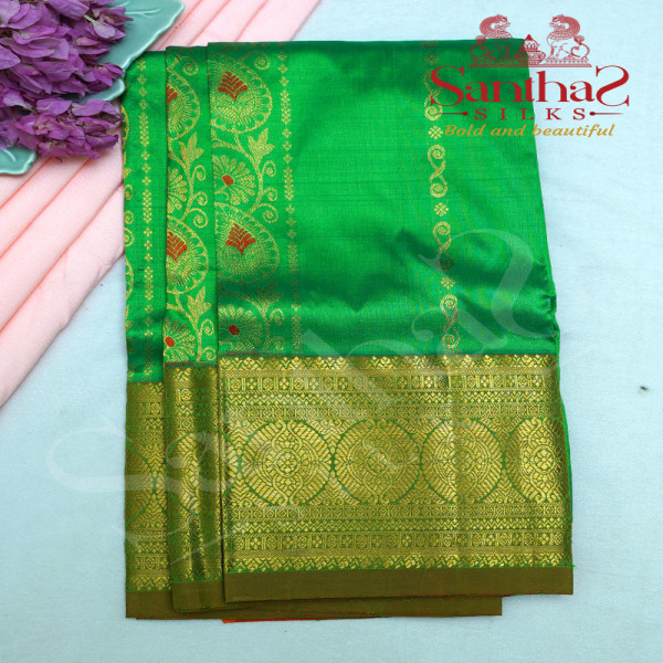 PARROT GREEN BODY WITH GOLD ZARI BORDER & CONTRAST BLOUSE