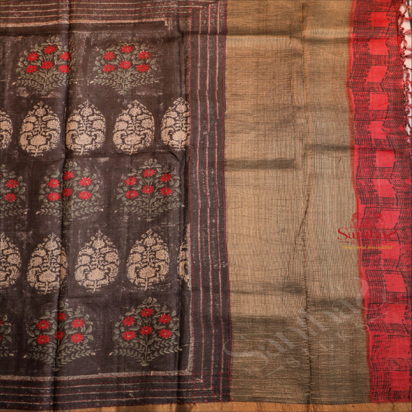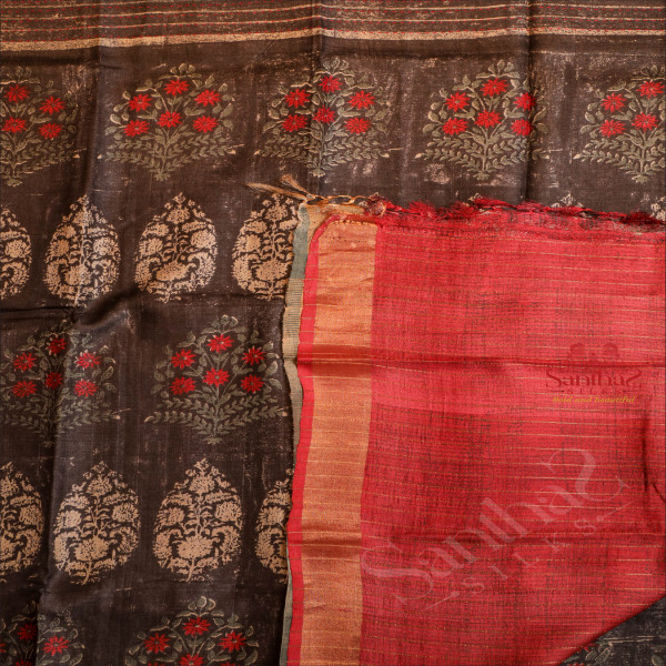 BLACK COLOUR TUSSAR SAREE WITH DIGITAL PRINT FLORAL MOTIFS WITH CONTRAST BLOUSE