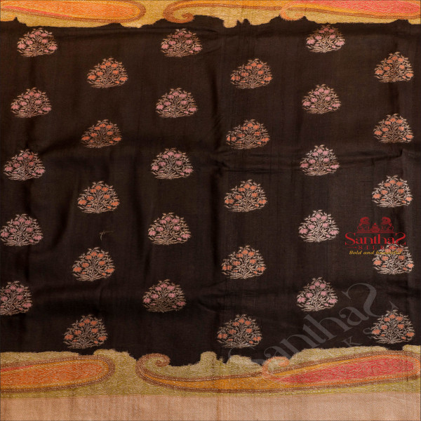 BLACK COLOUR BANARAS SAREE BODY WITH MULTI COLOUR THREAD WORK DESIGN AND CONTRAST PALLU & BLOUSE