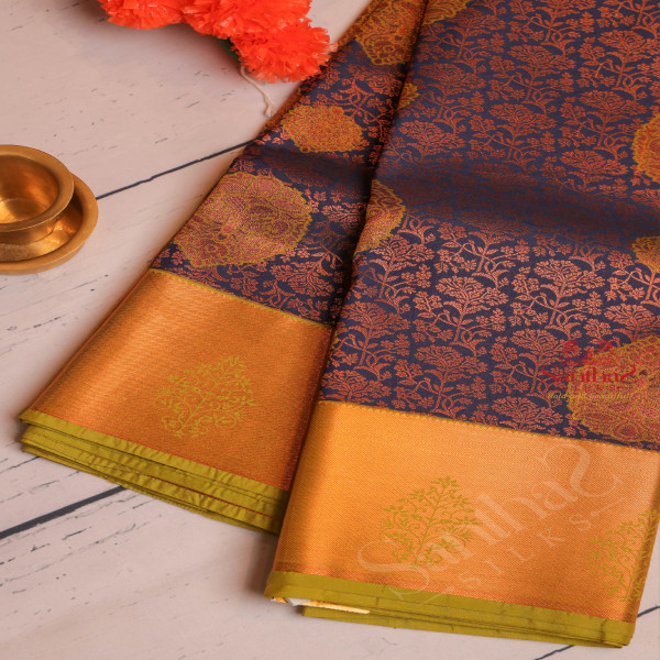 DARK BLUE COLOUR BODY WITH COPPER ZARI LEAF BUTTA WITH CONTRAST BLOUSE & BORDER
