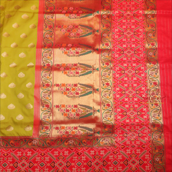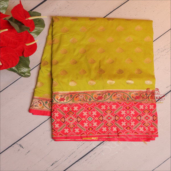 PURE BANARAS SILK SAREE IN YELLOW GREEN COLOUR WITH RED COLOUR PALLU & BLOUSE