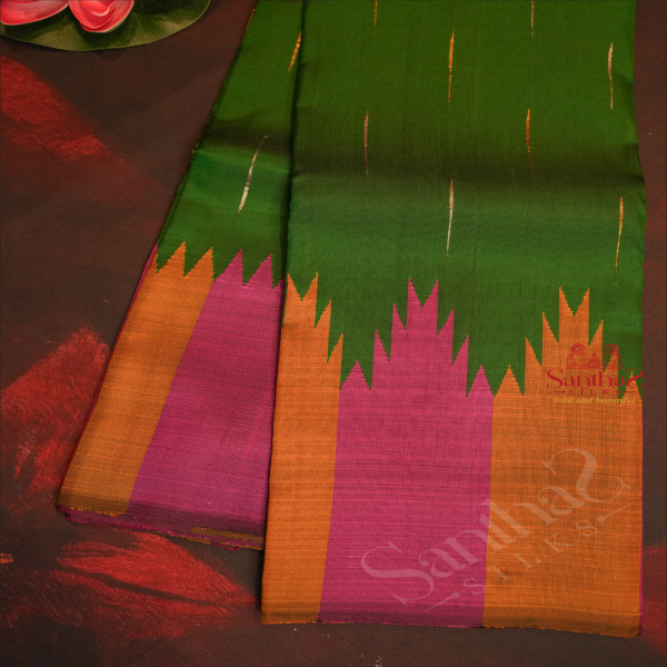 BORDERLESS BOTTLE GREEN COLOUR BODY WITH THALAMBOO MOTIF WITH CONTRAST BLOUSE