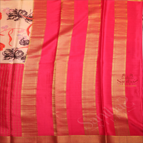 SANDAL COLOUR MYSORE SILK SAREE WITH FLORAL DIGITAL PRINT WITH CONTRAST BLOUSE & BORDER