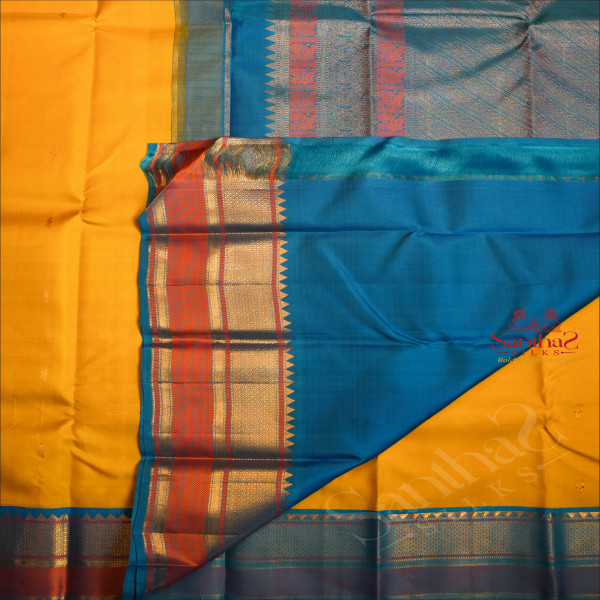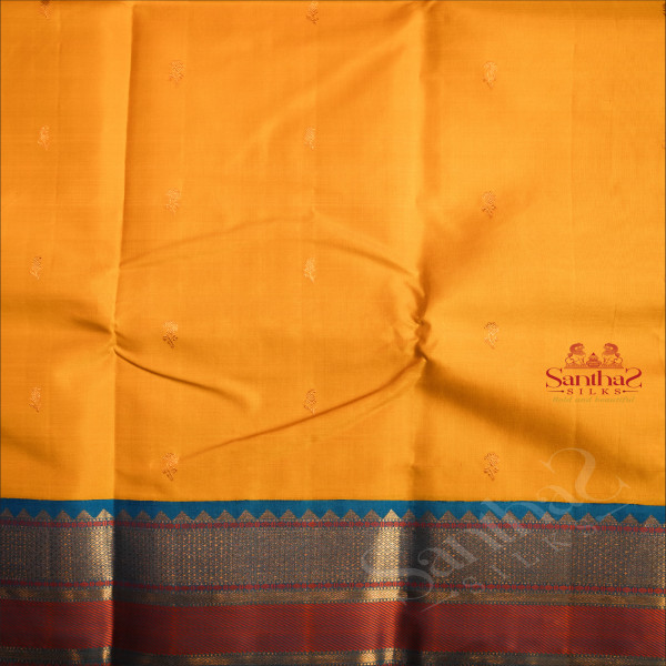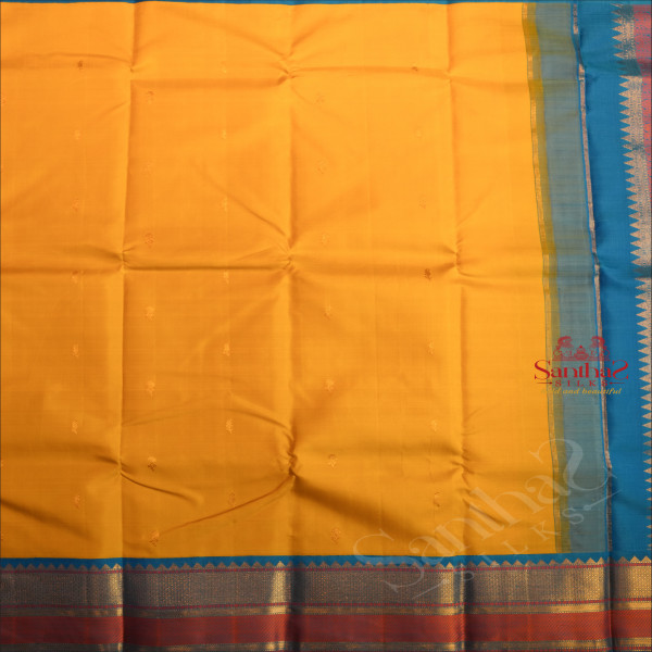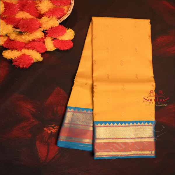 MUSTARD YELLOW COLOUR BODY WITH GOLDEN ZARI FLOWER BUTTA WITH CONTRAST BLOUSE & BORDER