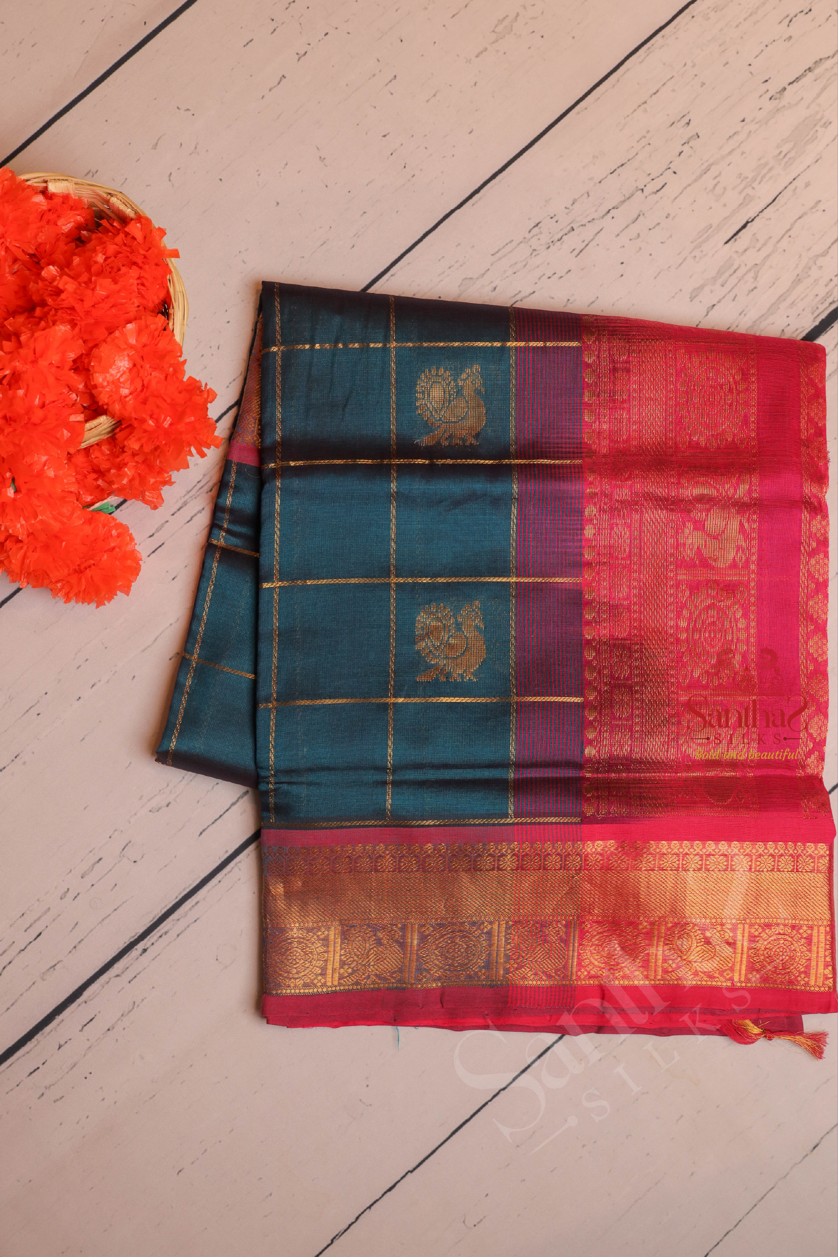 PEACOCK BLUE COLOUR CHECKED BODY WITH GOLDEN ZARI ANNAM BUTTA WITH CONTRAST BLOUSE & BORDER