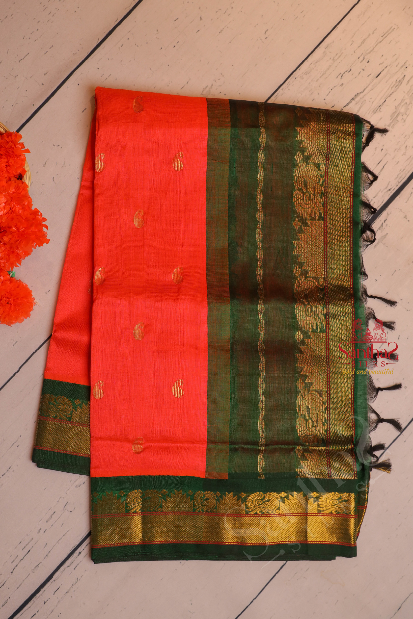 ORANGE COLOUR BODY WITH GOLDEN ZARI MANGO BUTTA WITH CONTRAST BLOUSE & BORDER