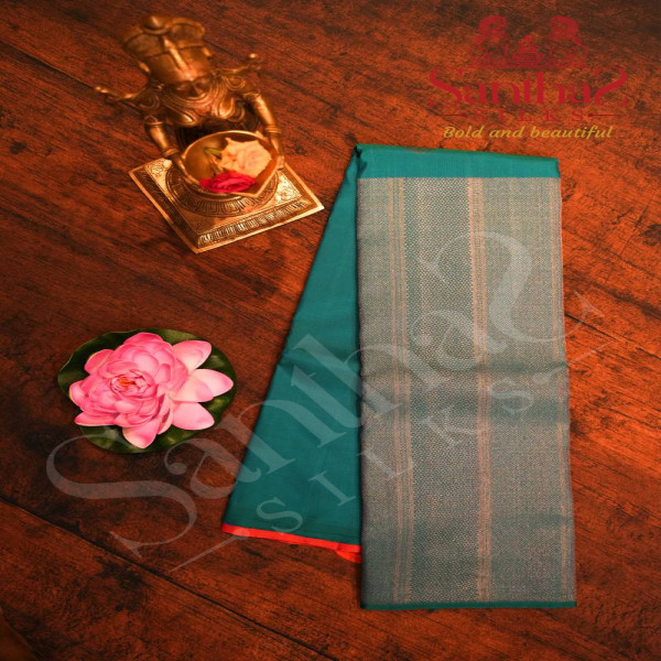 BORDERLESS PEACOCK BLUE COLOUR BODY WITH SILVER ZARI MOTIFS AND CONTRAST BLOUSE
