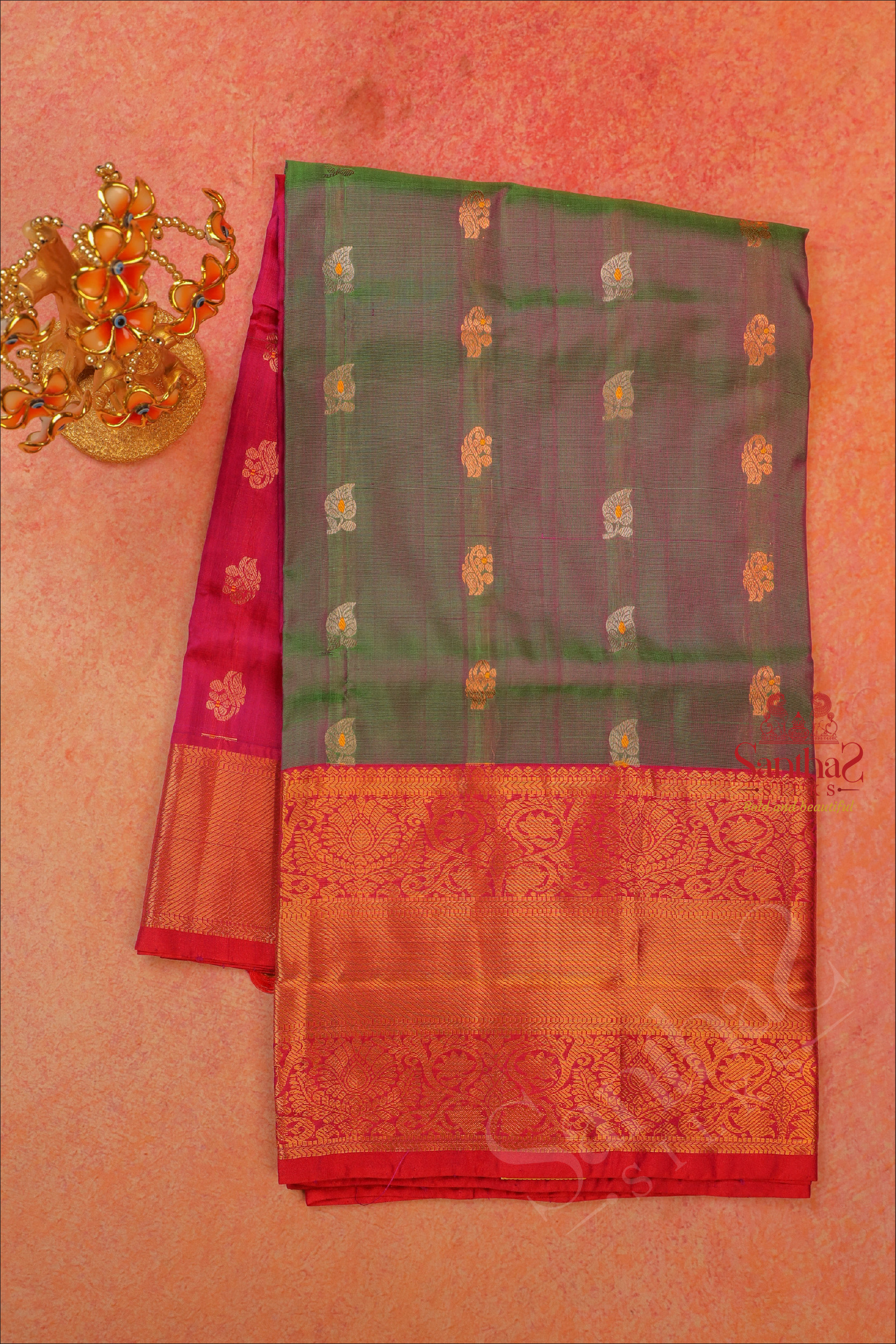 GREEN AND VIOLET SHADE BODY WITH GOLDEN ZARI LEAF BUTTA WITH CONTRAST BLOUSE & BORDER