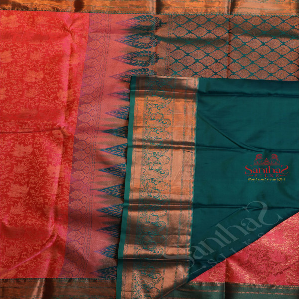 DARK PINK COLOUR BODY WITH JACQUARD FLORAL EMBOSED WITH CONTRAST BLOUSE & BLUE BORDER