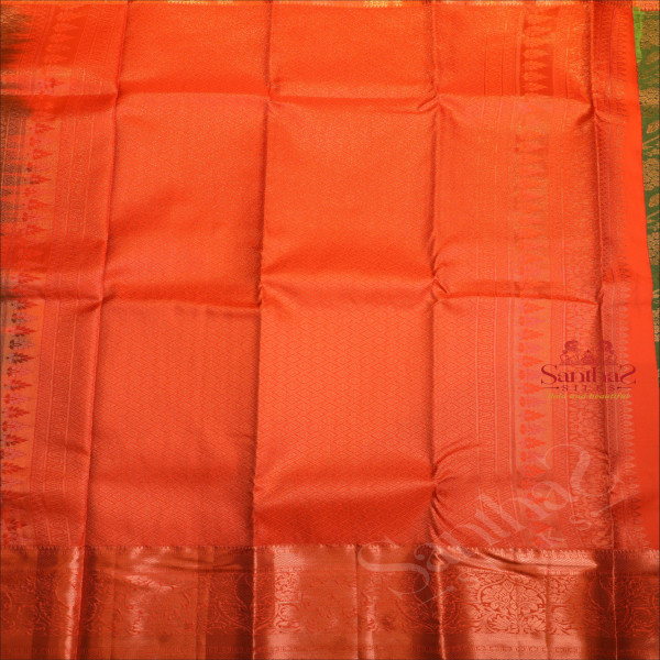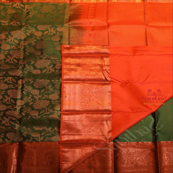 JADE GREEN COLOUR BODY WITH JACQUARD FLORAL EMBOSED IN COPPER ZARI WITH CONTRAST RED BLOUSE & BORDER
