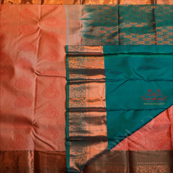 SAND PEACH COLOUR BODY WITH JACQUARD FLORAL EMBOSED WITH CONTRAST GREEN BLOUSE & BORDER