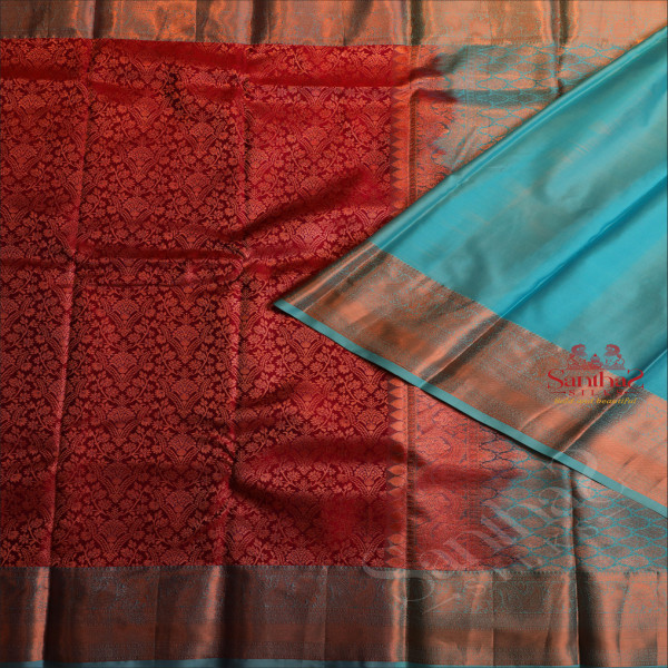 MAROON COLOUR BODY WITH JACQUARD FLORAL EMBOSED IN COPPER ZARI WITH CONTRAST BLUE BLOUSE & BORDER