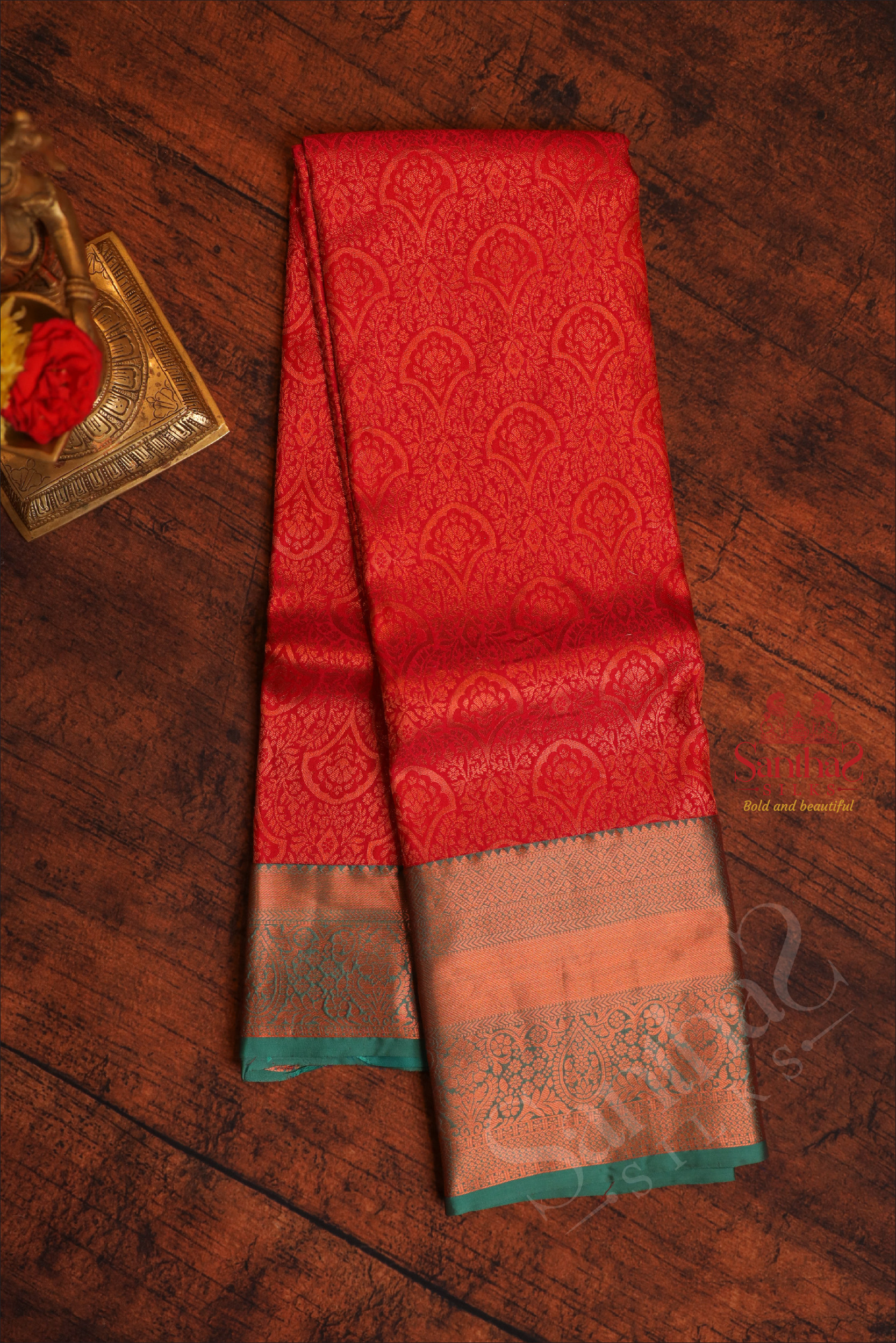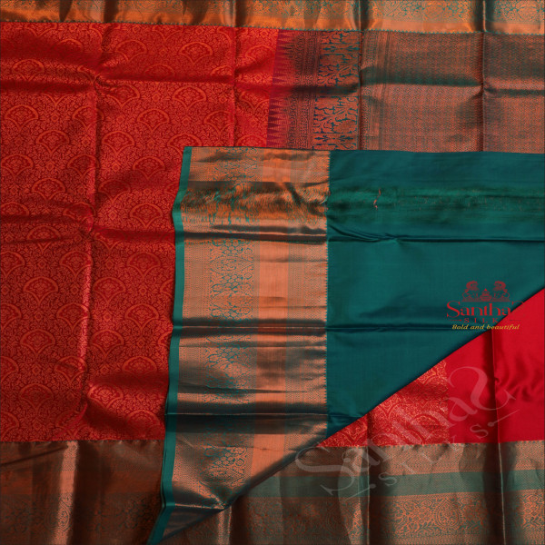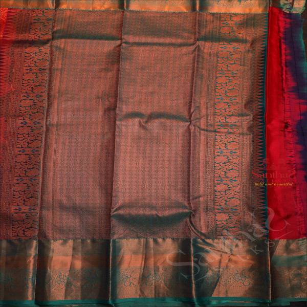 RED COLOUR BODY WITH JACQUARD FLORAL EMBOSED WITH CONTRAST GREEN BLOUSE & BORDER