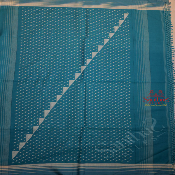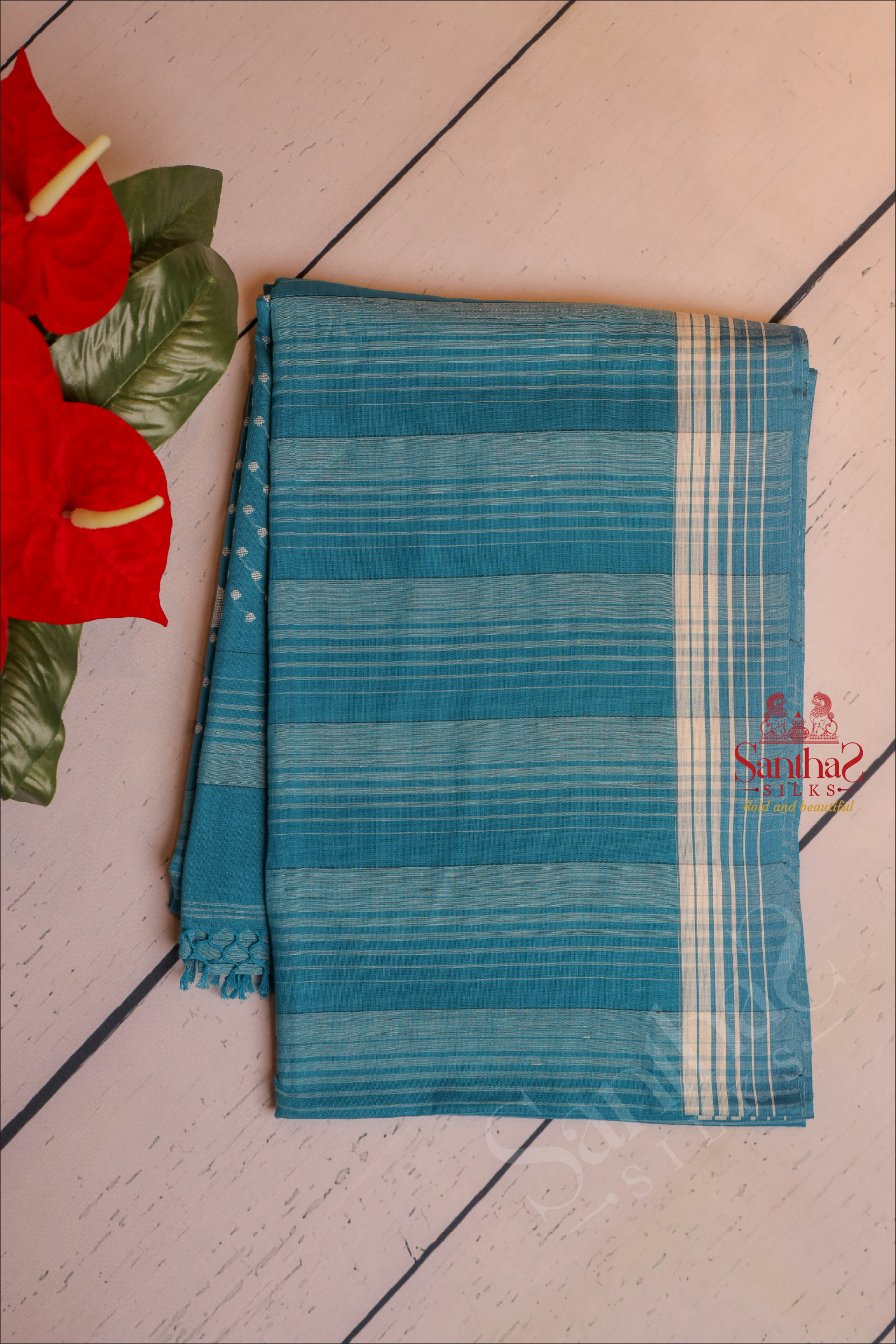 INTEL BLUE COLOUR COTTON SAREE BODY WITH STRIPS AND SELF COLOUR PALLU WITH WHITE THREAD BUTTAS & BLOUSE