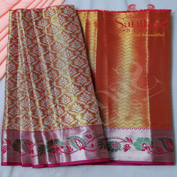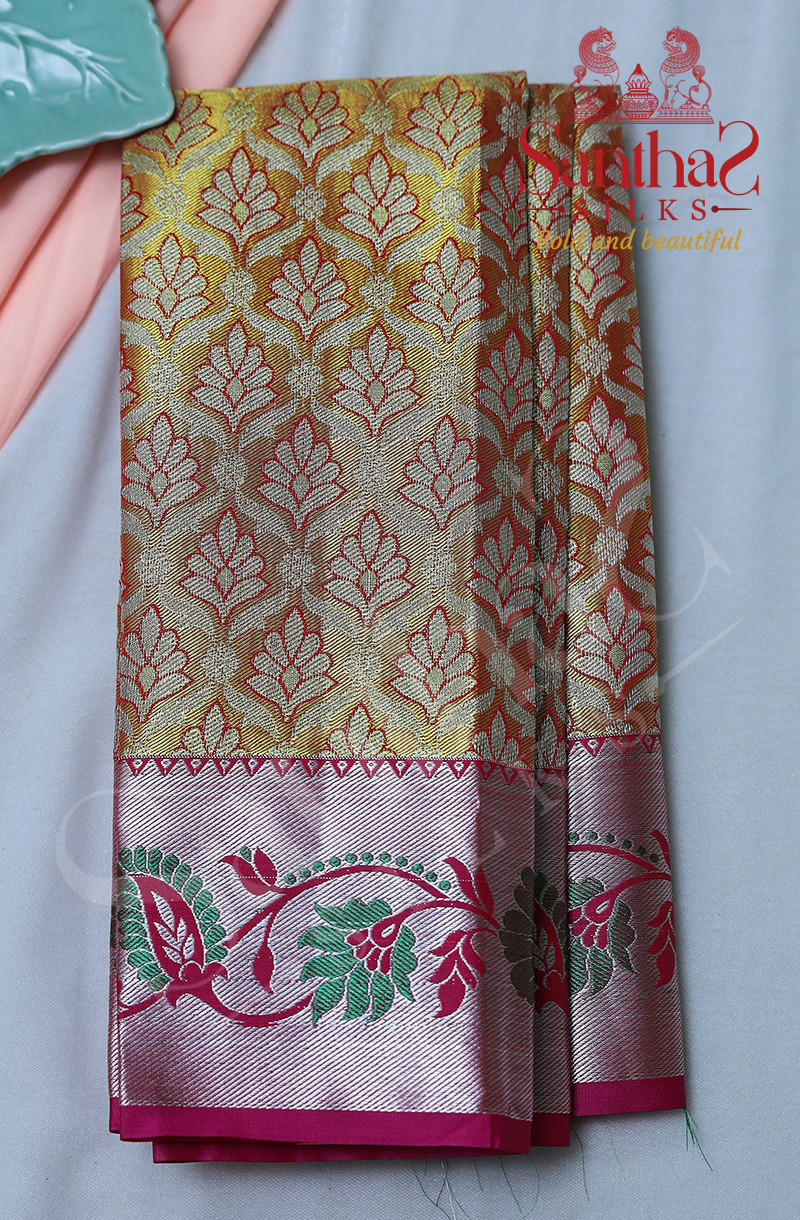 MUSTARD COLOUR TISSUE BODY WITH PINK BLOUSE & BORDER