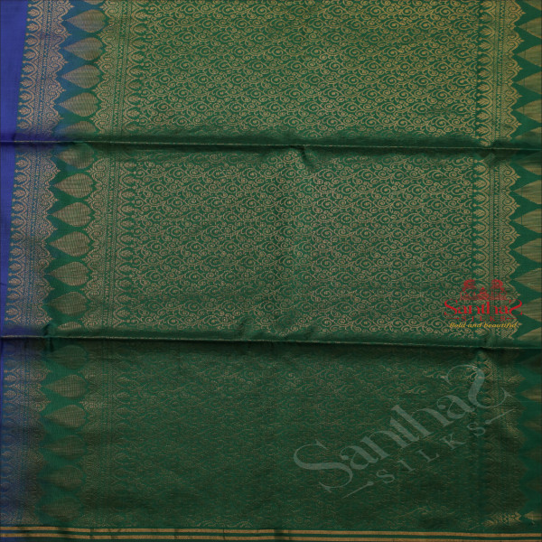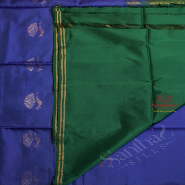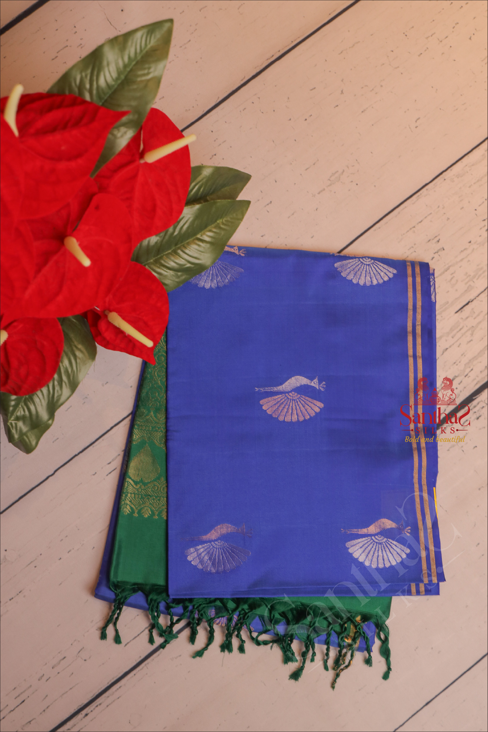 PEPSI BLUE COLOUR BODY WITH GOLDEN ZARI PEACOCK BUTTA WITH CONTRAST BLOUSE & BORDER