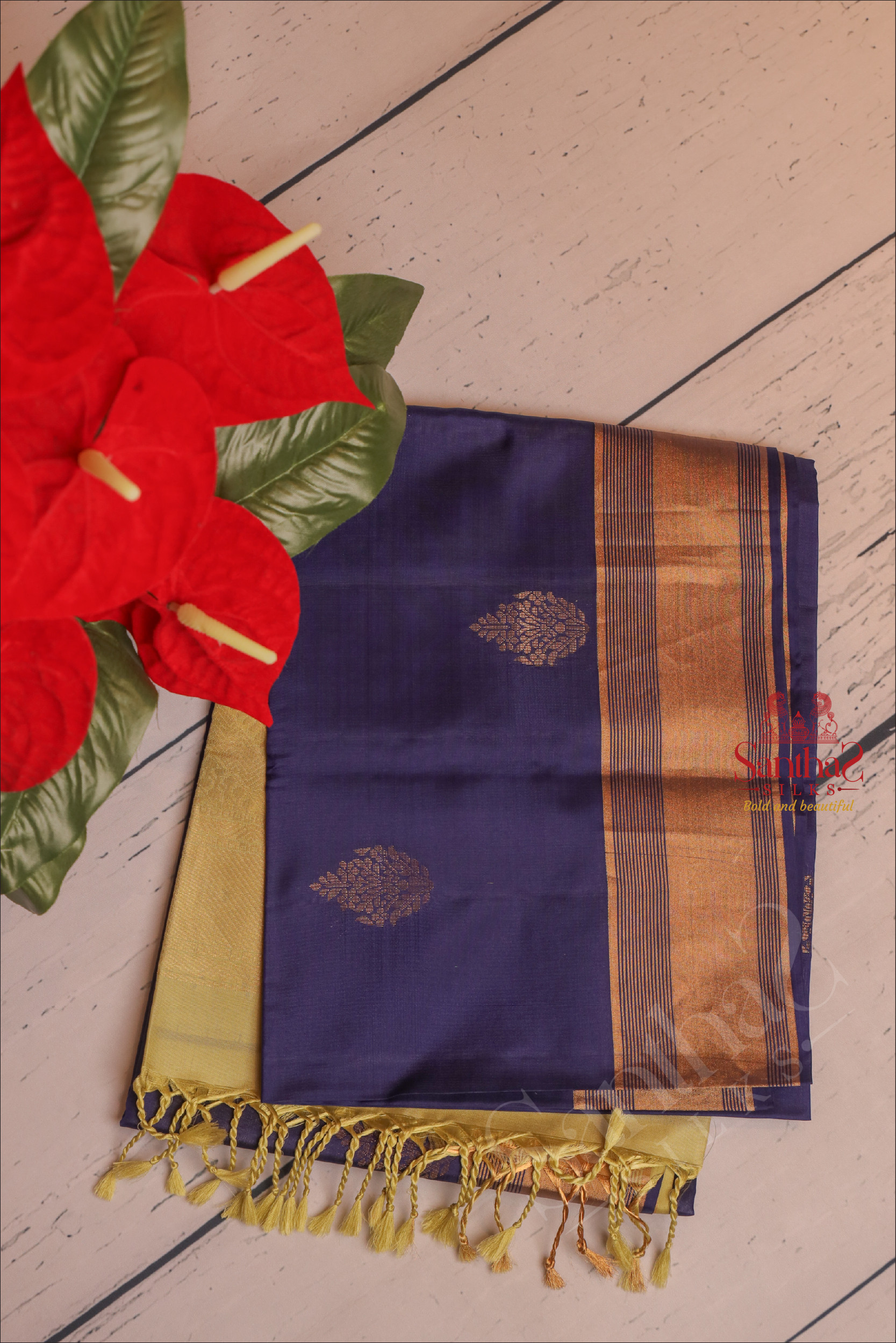 PEPSI BLUE COLOUR BODY WITH GOLDEN ZARI BUTTA WITH CONTRAST BLOUSE & BORDER