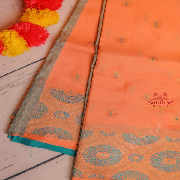 CREAMY PEACH COLOUR BODY WITH GOLDEN ZARI COIN BUTTA WITH CONTRAST BLOUSE & BORDER