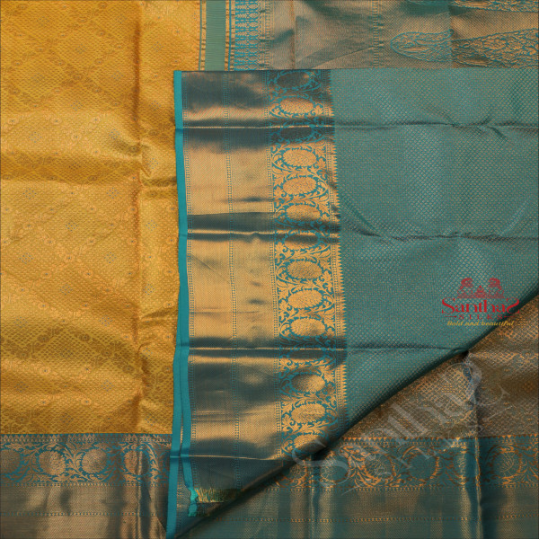 LEMON YELLOW COLOUR BODY WITH GOLDEN ZARI EMBOSED WITH CONTRAST BLOUSE & BORDER