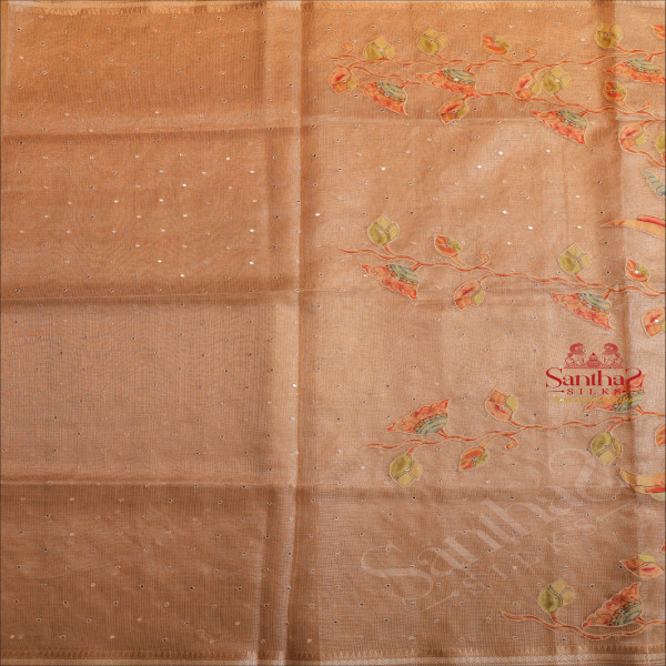 KOTA TISSUE SAREE WITH CRANE & FLORAL APPLICK WORK IN METALIC COPPER COLOUR