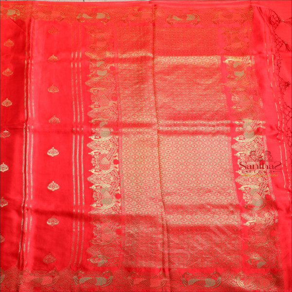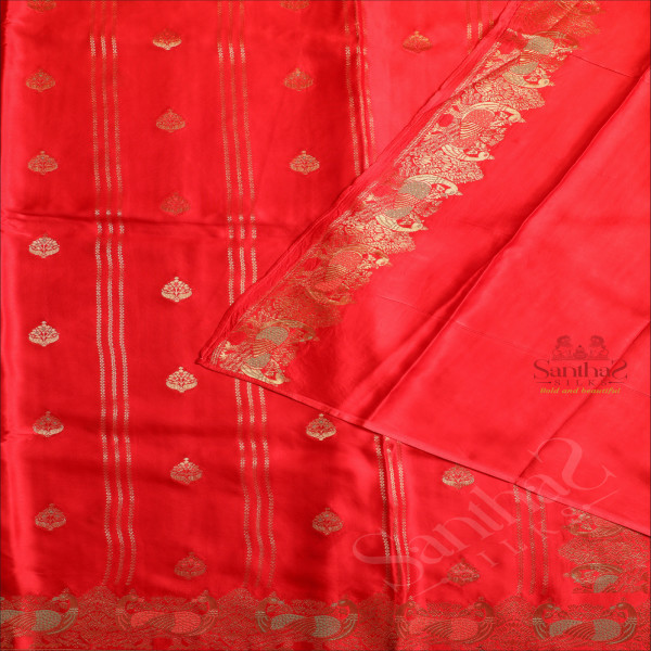 RED COLOUR SATIN BANARAS SAREE WITH ZARI FLORAL BUTTA AND SELF BLOUSE