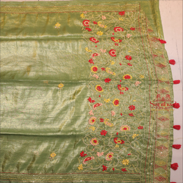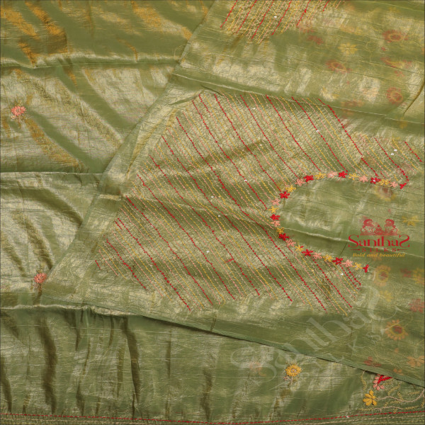 GREEN COLOUR CRUSH TISSUE SAREE WITH FLORAL EMBROIDERY DESIGN AND SELF BLOUSE