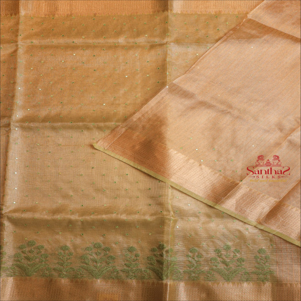 KOTA TISSUE SAREE IN LIME GREEN COLOUR WITH MIRRON WORK EMBORIDERY AND GOLDEN ZARI BORDER