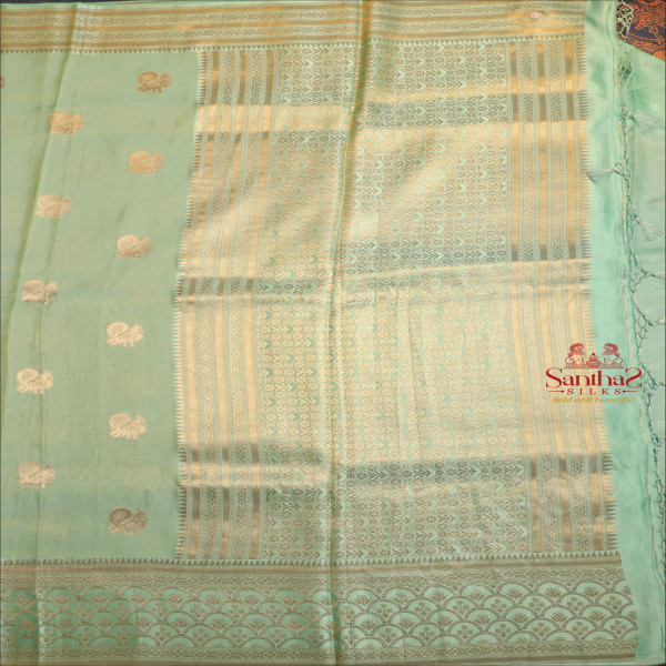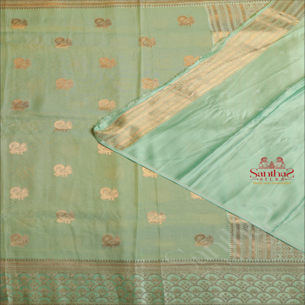 PARRIS GREEN COLOUR SATIN BANARAS SAREE WITH ZARI ANNAM BUTTA AND SELF BLOUSE