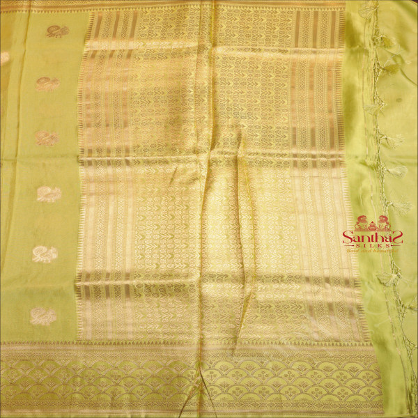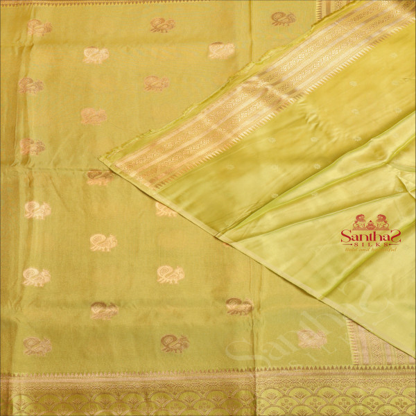 VOLT GREEN COLOUR SATIN BANARAS SAREE WITH ANNAM ZARI BUTTA AND SELF BLOUSE