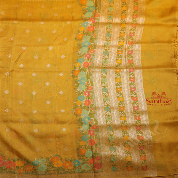 SEMI BANARAS SAREE IN FLUORESCENT GREEN WITH FLORAL WEAVING DESIGN