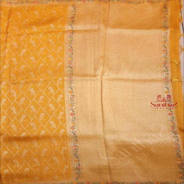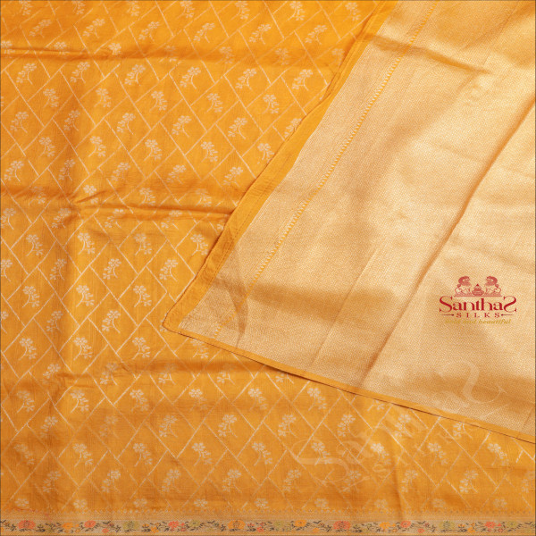 SEMI BANARAS SAREE IN MUSTARD YELLOW WITH FLORAL & DIAMOND SHAPE WEAVING DESIGN