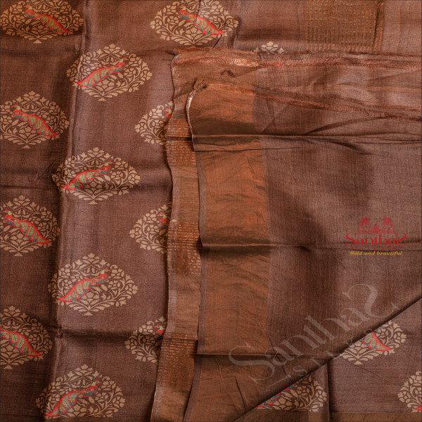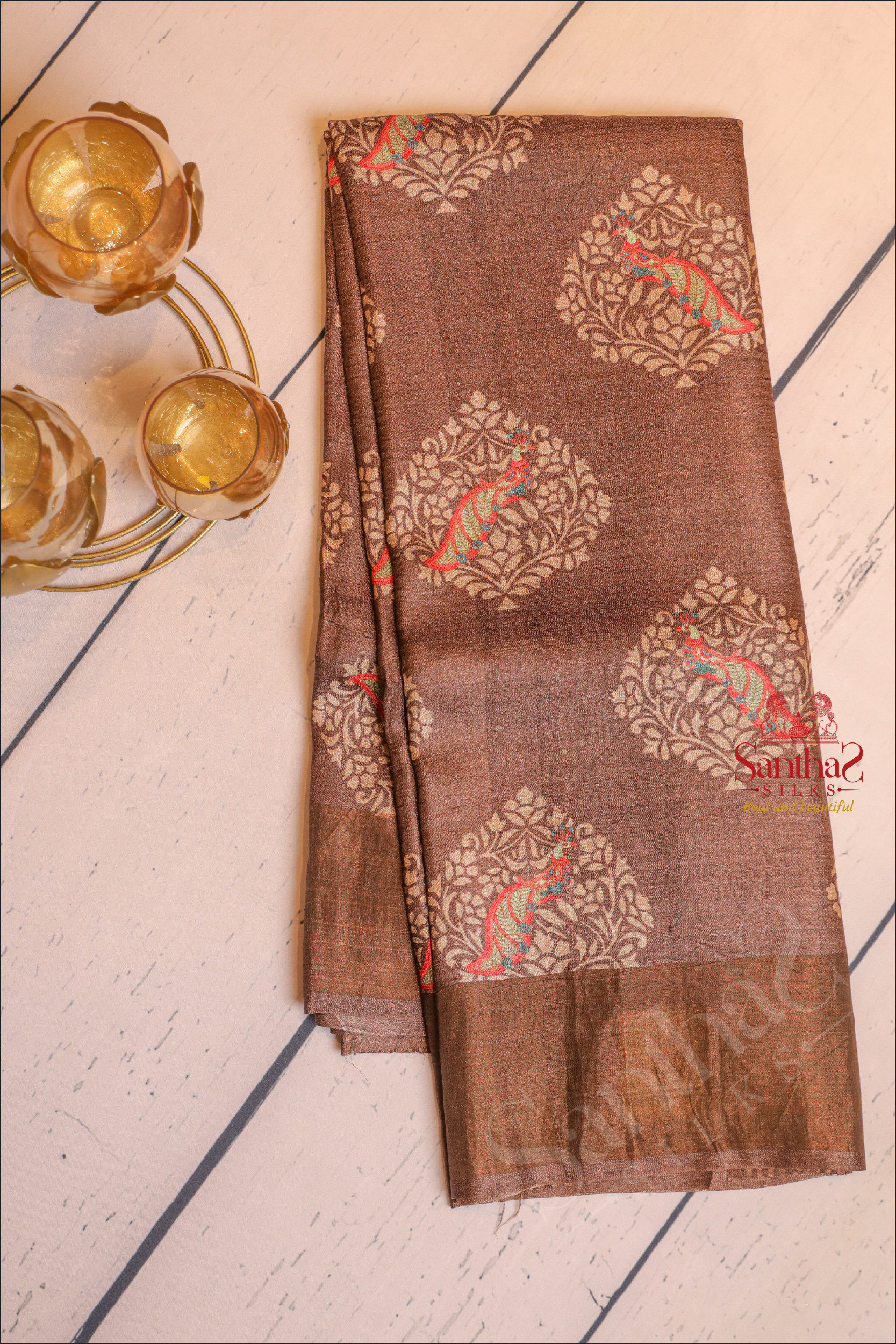 TUSSAR SAREE IN BROWN COFFEE COLOUR WITH DIGITAL PRINT MOTIF WITH SELF BLOUSE & BORDER