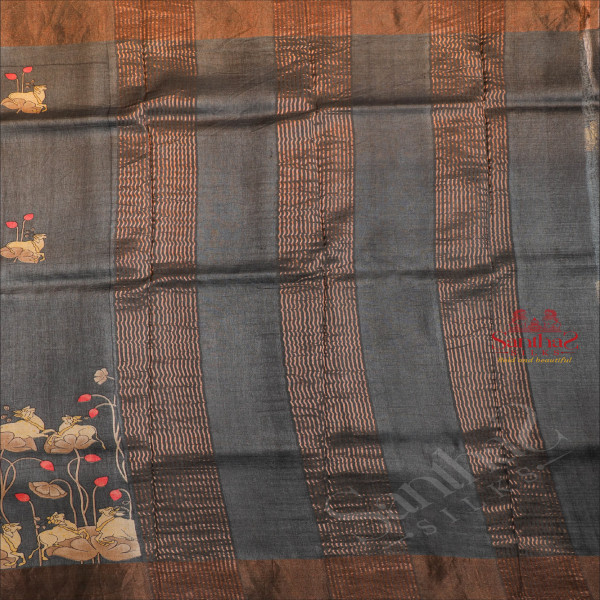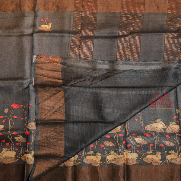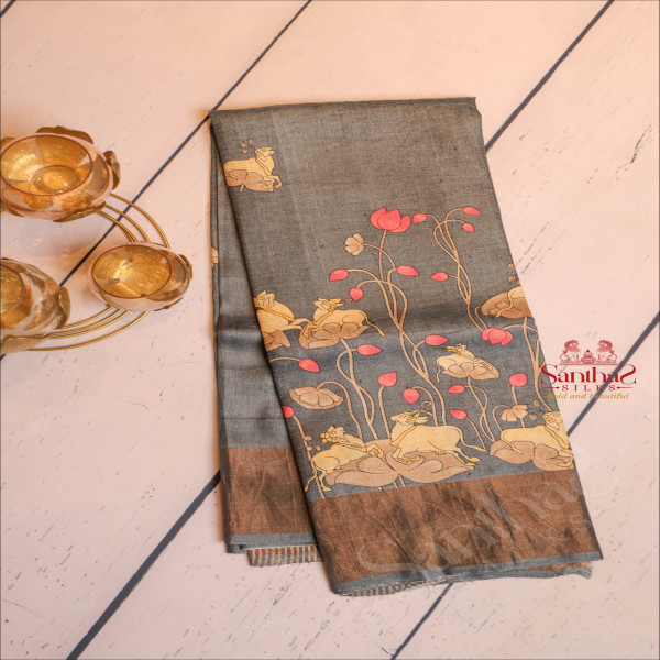 GREYISH BLUE COLOUR TUSSAR SAREE WITH DIGITAL PICHWAI PRINT SELF BLOUSE