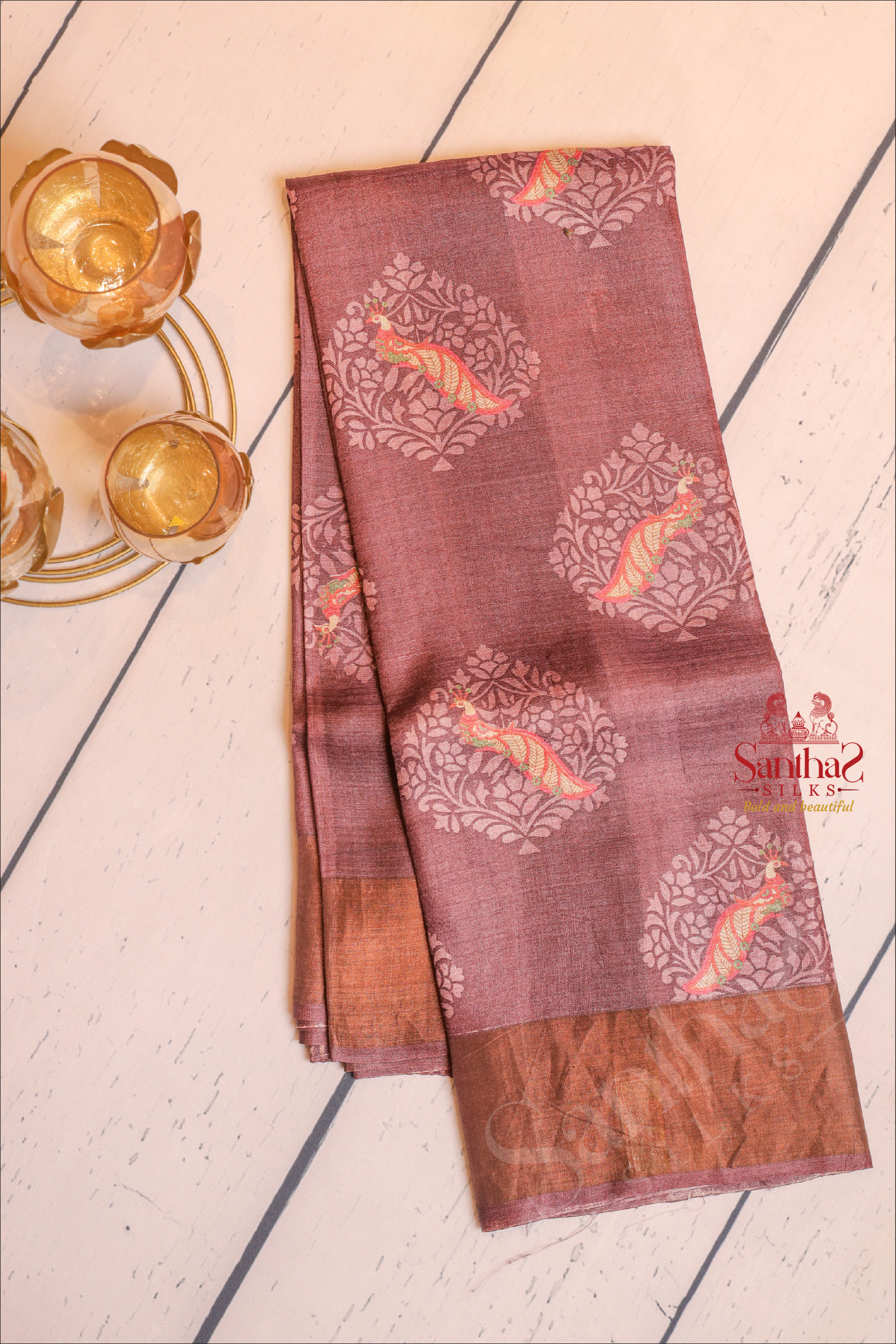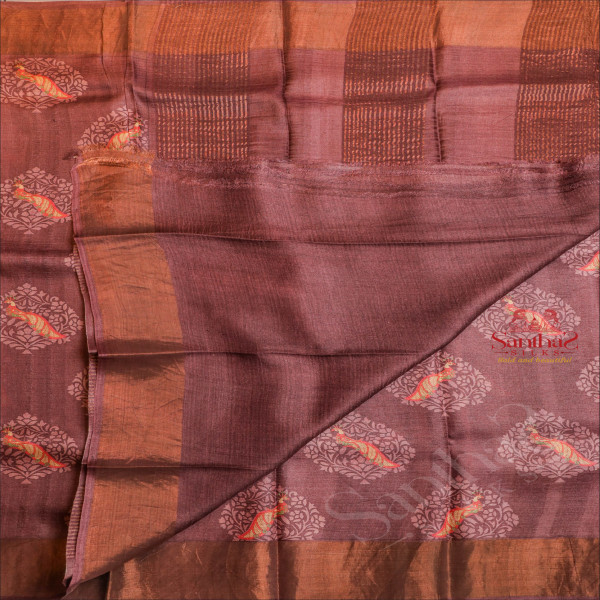 DARK PURPLE COLOUR TUSSAR SAREE WITH PRINTED FLORAL MOTIF WITH SELF BLOUSE