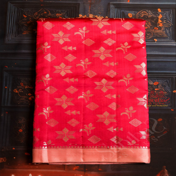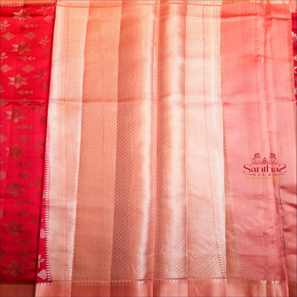 RANI PINK COLOUR RAW MANGO SAREE WITH SILVER ZARI MOTIF WITH CONTRAST BLOUSE & BORDER