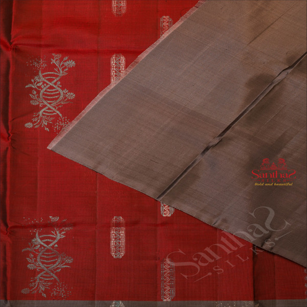 MAROON COLOUR BODY WITH SILVER ZARI FLORAL BUTTA WITH CONTRAST BLOUSE & BORDER