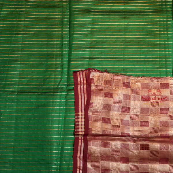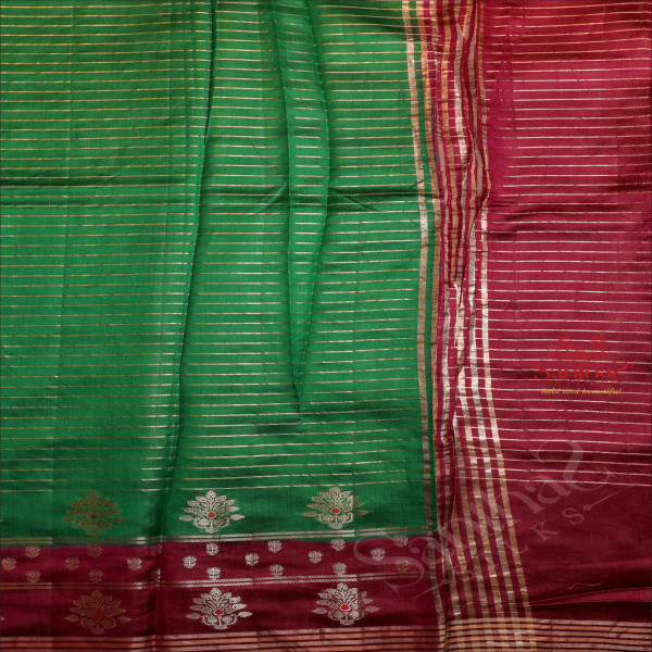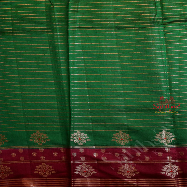FOREST GREEN COLOUR CHINIYA SAREE WITH GOLDEN ZARI STRIPS & BUTTA AND CONTRAST COLOUR PALLU & BLOUSE