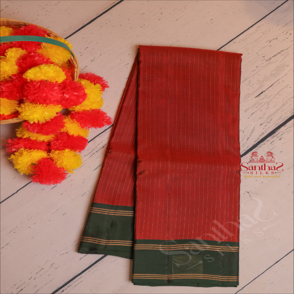 VERMILION RED COLOUR BODY WITH GOLDEN ZARI STRIPS WITH CONTRAST BLOUSE & BORDER