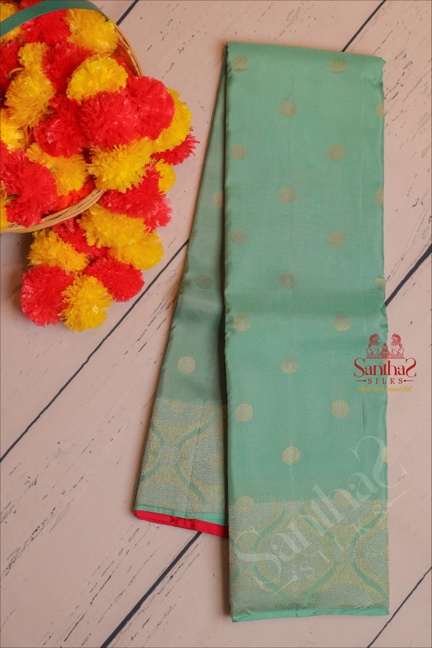 BORDERLESS TURQUOISE BLUE COLOUR BODY WITH GOLDEN ZARI COIN BUTTA WITH CONTRAST BLOUSE