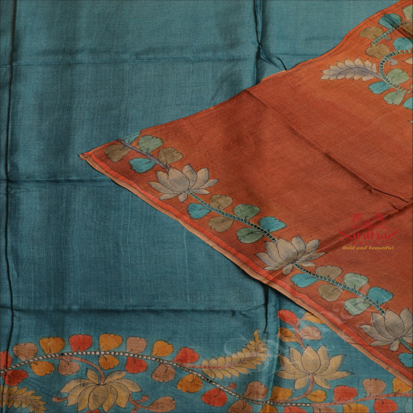 BLUE COLOUR TUSSAR SAREE WITH KALAMKARI PRINT WITH CONTRAST FLORAL PRINT BLOUSE