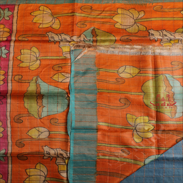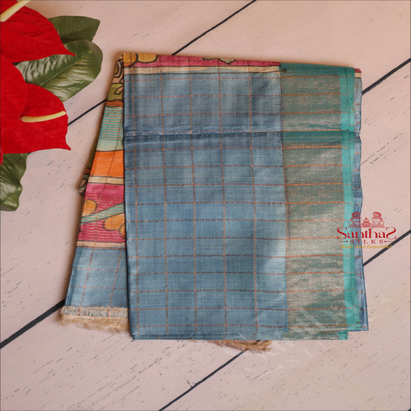 SPRUCE BLUE COLOUR TUSSAR SAREE CHECKED WITH KALAMKARI PRINT WITH SELF BLOUSE