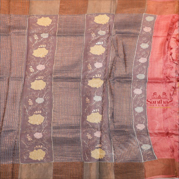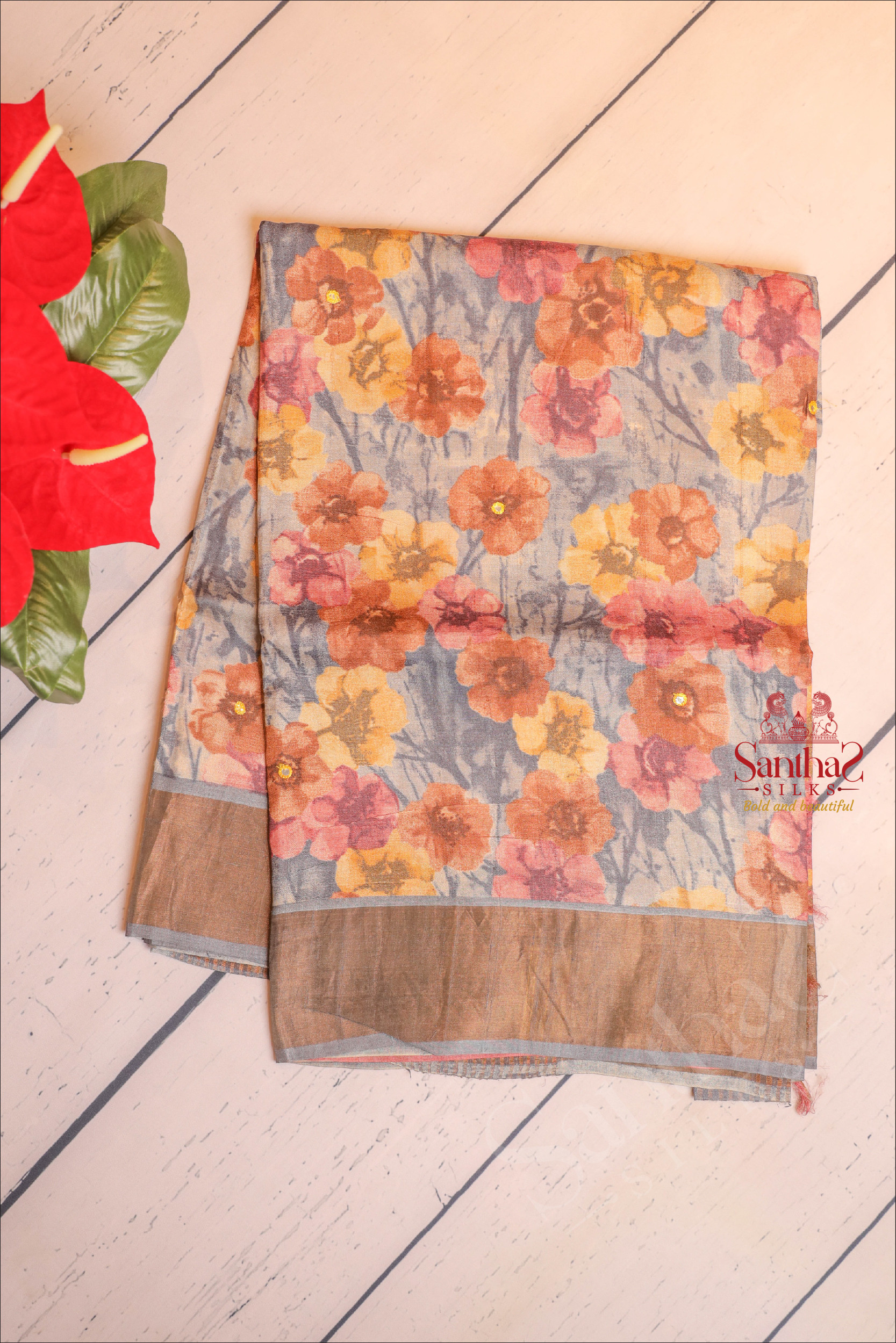 SLATE BLUE COLOUR TUSSAR SAREE WITH PRINTED FLORAL PATTERN WITH CONTRAST BLOUSE