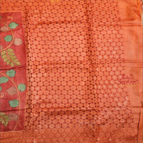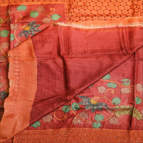 PEACH ORANGE COLOUR TUSSAR SAREE WITH CUT WORK AND KALAMKARI PRINT WITH CONTRAST BLOUSE