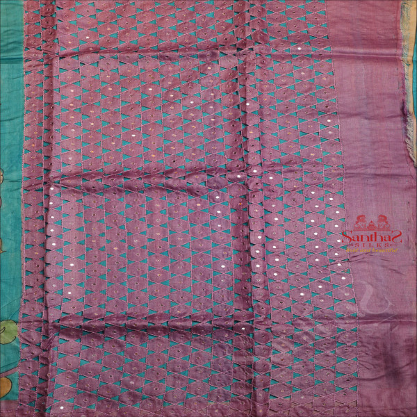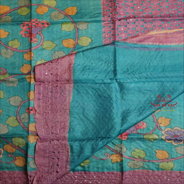 PURPLE COLOUR TUSSAR SAREE WITH CUTWORK AND KALAMKARI PRINT WITH CONTRAST BLOUSE