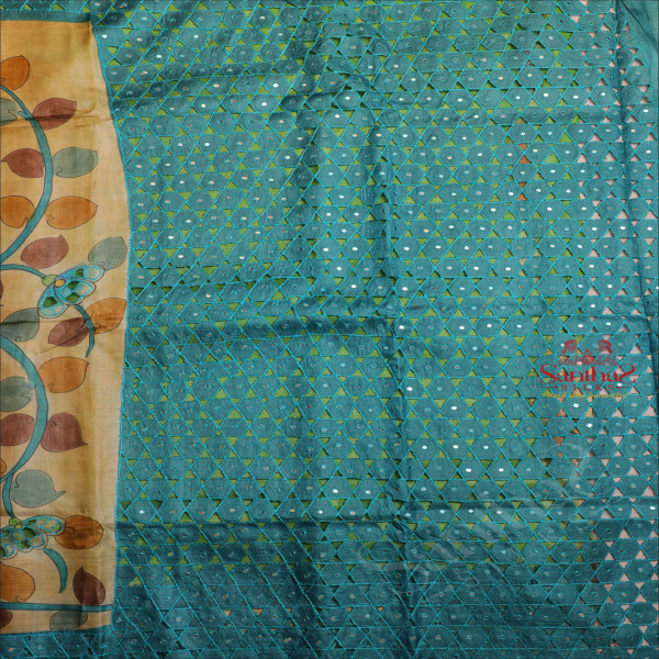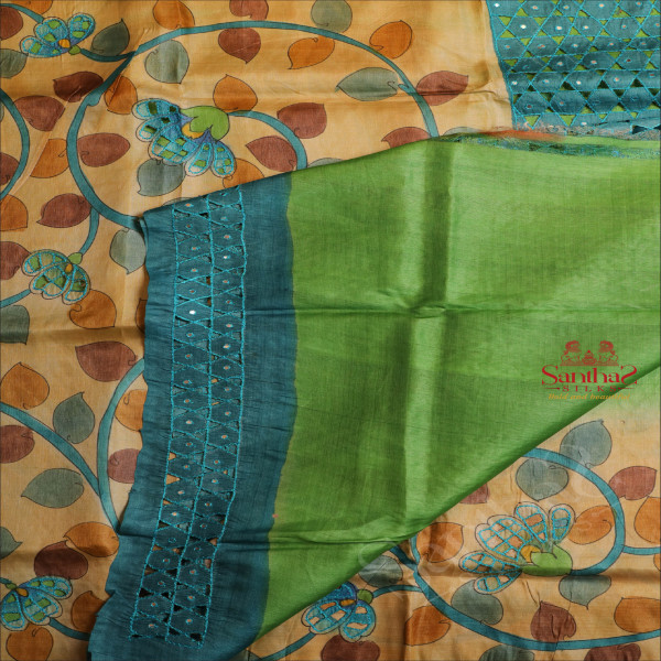 BLUE COLOUR TUSSAR SAREE WITH CUT WORK AND KALAMKARI PRINT WITH CONTRAST PRINTED BLOUSE