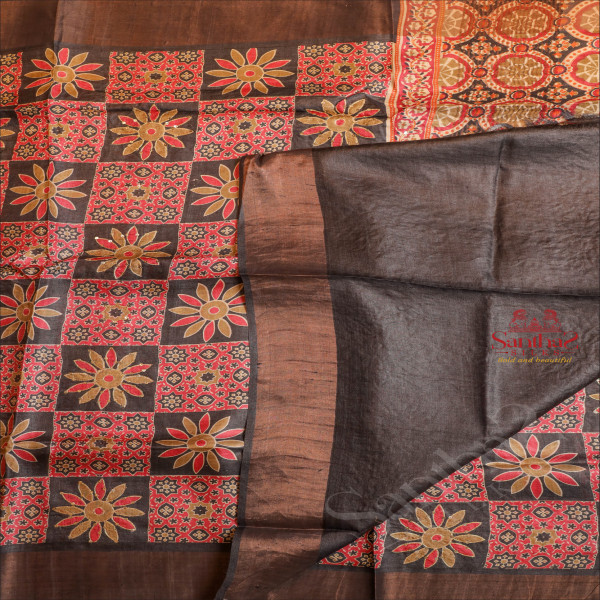BLACK COLOUR TUSSAR SAREE BODY WITH MULTI COLOUR DIGITAL PRINT DESIGNS AND CONTRAST DIGITAL PRINT PALLU & BLOUSE