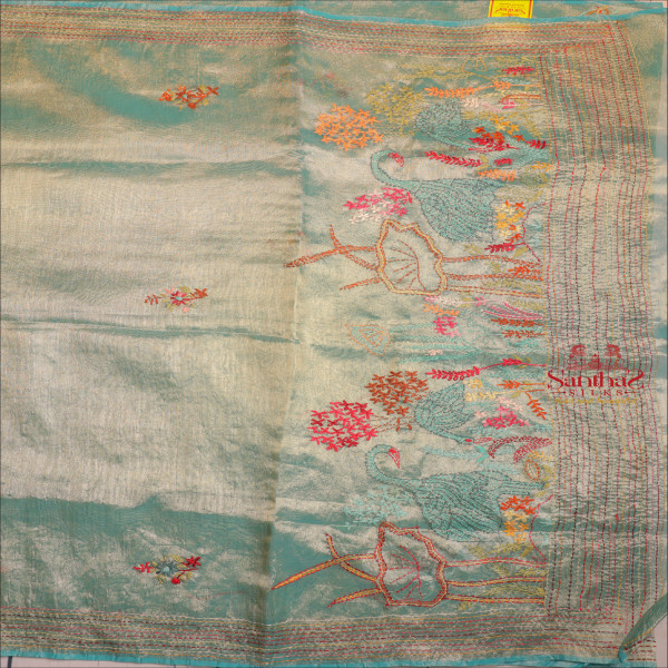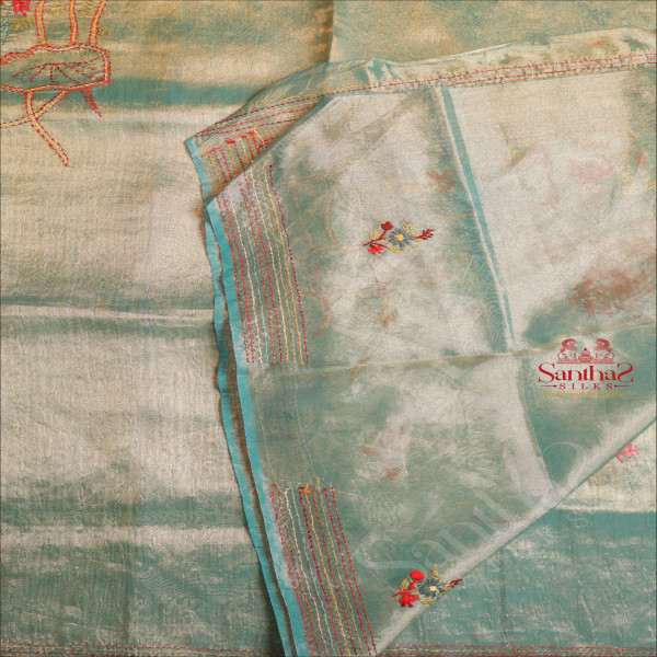 TISSUE SAREE WITH HAND EMBORIDERY WORK IN TEAL GREEN & GOLDEN COLOUR MIXED