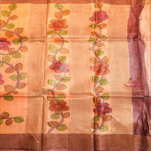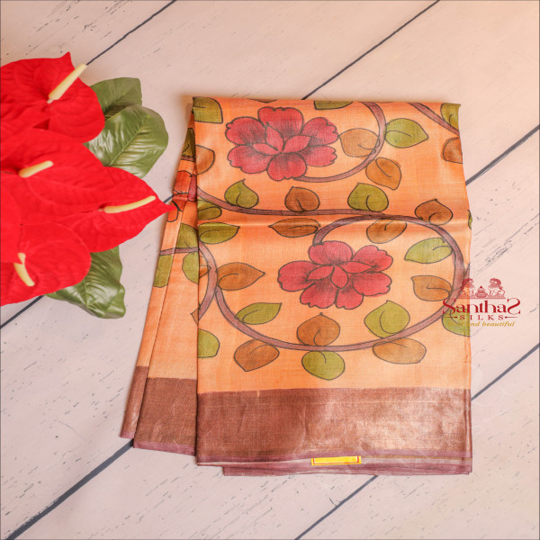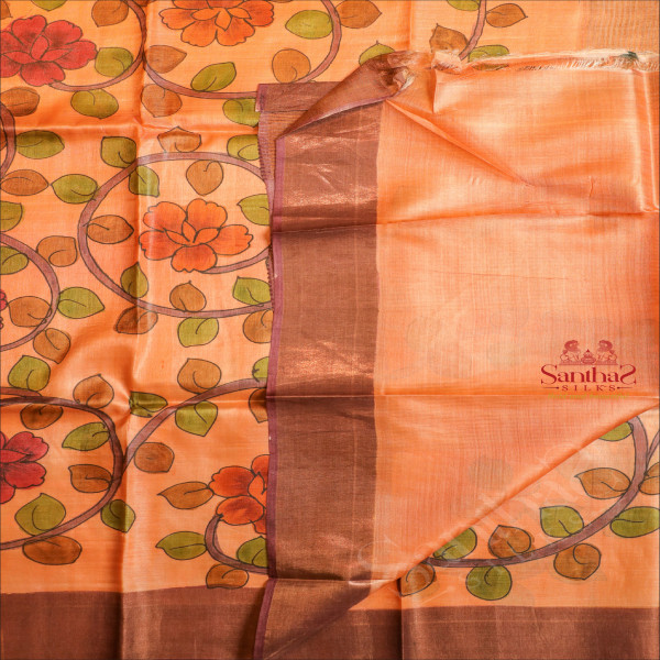 DARK PEACH COLOUR TUSSAR SAREE WITH KALAMKARI PRINT WITH SELF BLOUSE